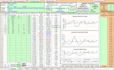 The "BeamAnal" calculates Shear Force, Bending Moment and Deflection at 31 positions along the member length. Member Lengths can be a single span simply supported or a 2, 3 or 4 span continuous over middle supports. The analysis results are produced in a tabular form and are also plotted in 3 graphs for rapid comprehension.